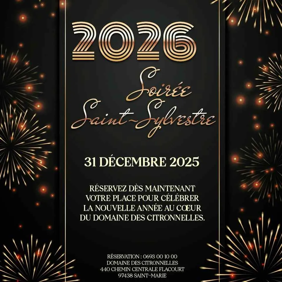 La soirée du Nouvel An le 31 décembre à Sainte-Marie promet un moment festif placé sous le signe de la gastronomie et de la convivialité. Au cœur d’un cadre élégant et accueillant, Domaine des Citronnelles organise une soirée unique pour célébrer l’arrivée de 2026 autour d’un menu élaboré et d’une ambiance chaleureuse. Un repas d’exception, des saveurs péi et un moment inoubliable pour accueillir la nouvelle année dans une atmosphère raffinée et conviviale.